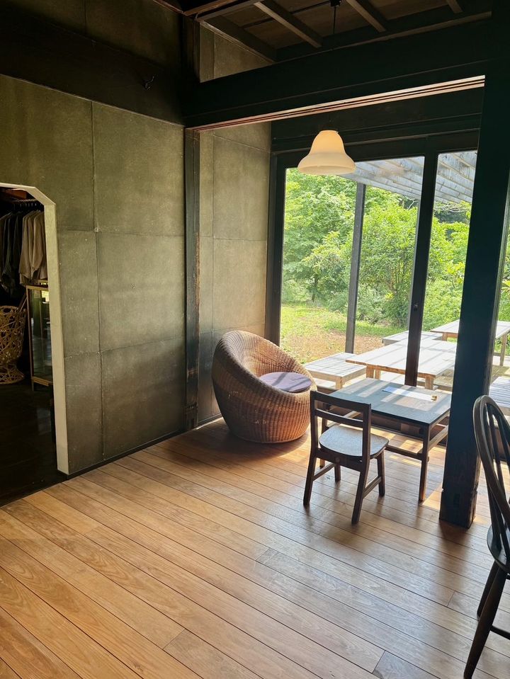 <写真>壁を隔てた先がカフェスペース。剣持勇のラタンチェアは古民家リノベーションにぴったりだなと再確認。テラス席も完備してあり、心の底からリラックスできる空間。