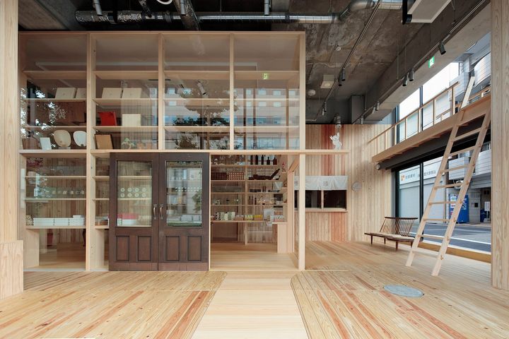 <写真>2021年に建替えられた老舗和菓子店・石村萬盛堂本店は、博多祇園山笠の決勝点「廻り止め」の横に位置し街の歴史と共にあるところ。福岡の井手健一郎(rhythmdesign)が手掛けたインテリアは清々しい木の空間に商品だけでなく、古い菓子の型や昔の写真をディスプレイ。石村萬盛堂2代目がコレクションしていた仙厓の愛らしい子どもの絵をあしらった暖簾や紙袋は見るだけで心温まります。
