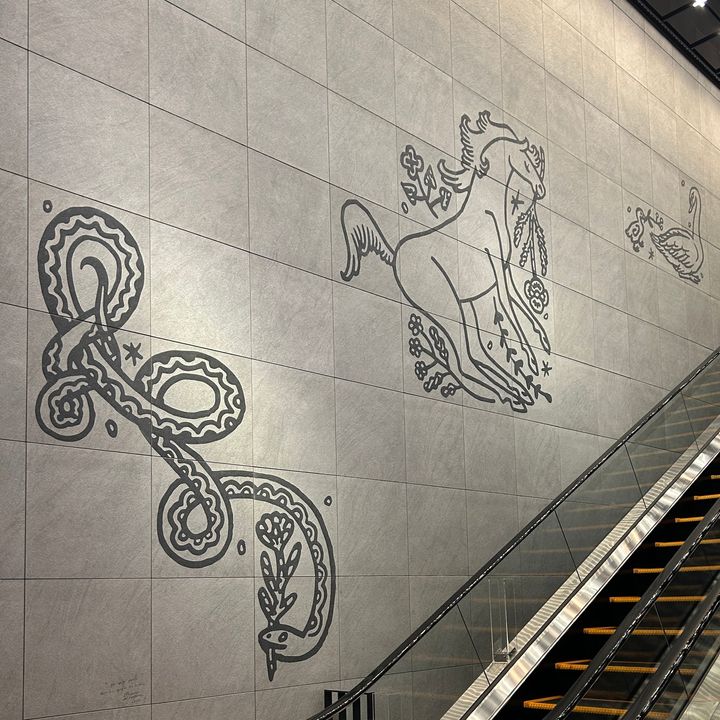<写真>福ビル・天神コア・天神ビブレ跡地にできたコーン・ペダーセン・フォックス・アソシエイツ設計の大型複合ビルに、福岡を拠点とする鹿児島睦の大きな壁画が。