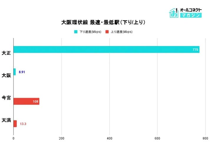 駅別に見ると、「新今宮駅」が上り・下りともに優秀な速度を記録した一方、利用者の多い「大阪駅」では下り8.91Mbpsと比較的遅い結果となりました。最も下り速度が速かったのは「大正駅」で775Mbpsを記録しており、駅や区間によって速度にバラつきはあるものの、全体として安定した通信品質が維持されていることがわかります。