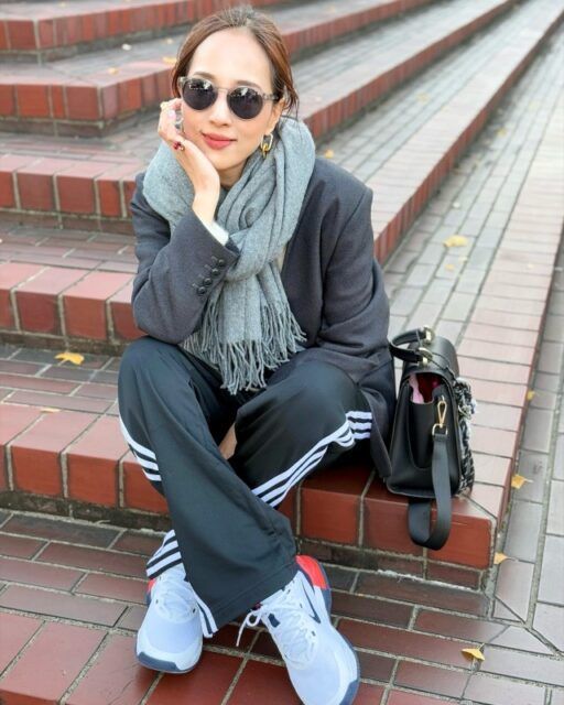 ジャケットの地味見えを避けるためには、あえてテイストが違うアイテムを合わせるのも効果的。例えばスウェットやショートレギンスとの組み合わせは、40代にこそおすすめしたいバランスです。きれいめジャケットとスポーティな服のミックスが洗練されたコントラストを生み出し、シャレた雰囲気に。