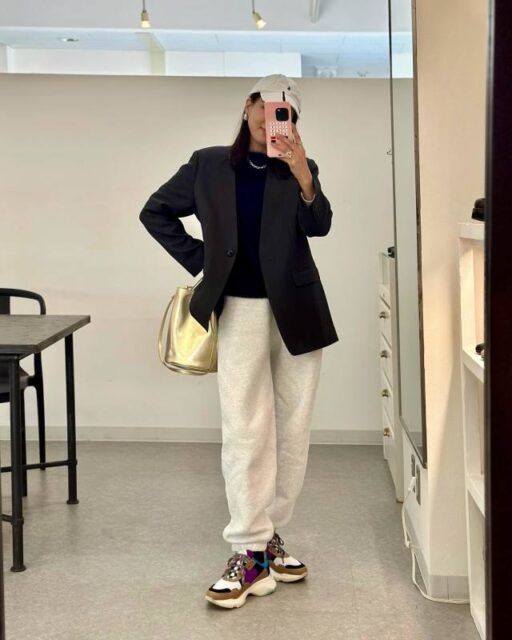 こちらではジャケットにスウェットパンツを合わせてスタイリング。加えて足元にスニーカーを選ぶことでより軽やかな印象となり、ジャケットのカジュアル見せに成功しています。