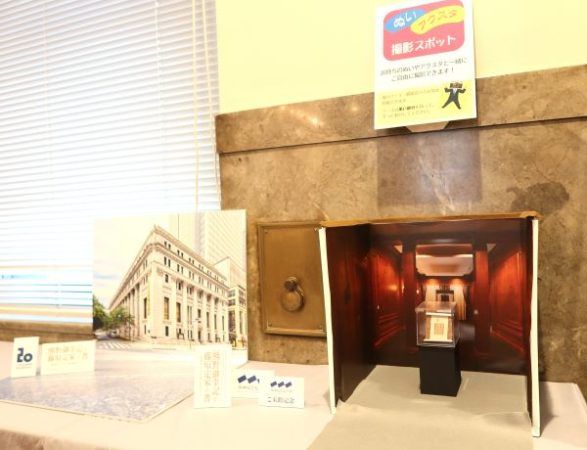 ミニチュアの展示ケースと三井記念美術館の建物写真を背景に記念撮影が可能なぬいアクスタ撮影スポットもありますので利用してみてはいかがでしょう。