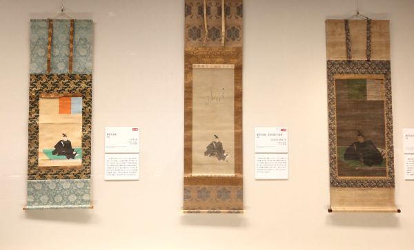 展示室4 右から、藤原定家画像 和歌色紙形 1幅 伝藤原信実筆 江戸時代・17世紀、藤原定家画像 道晃法親王自画賛 1幅 照高院宮道晃法親王筆 江戸時代・17世紀、藤原定家画像 1幅 土佐光芳筆 江戸時代・18世紀 すべて北三井家旧蔵 三井記念美術館蔵[/caption]
