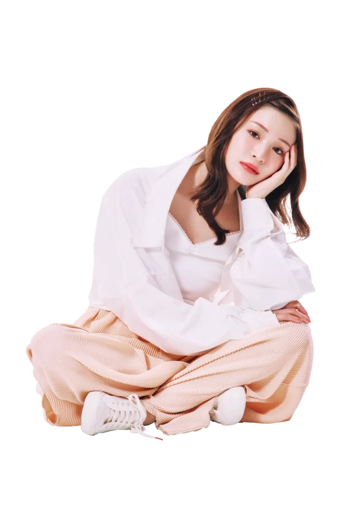 オレンジパンツ 19,800円/maison ELLIE 白シャツ 13,530円/NOT YOUR ROSE(HANA KOREA)白キャミソール 5,830円 /ILLIGO(HANA SHOWROOM)スニーカー 11,000円/Mardi Mercredi(MARDI MERCREDI JAPAN)ヘアピン/スタイリスト私物