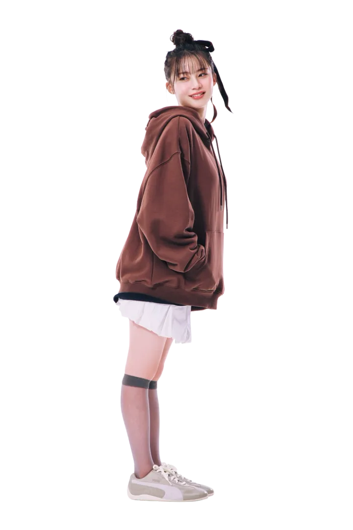 ビッグトップス×ミニできゃしゃ見えを狙って。ブラウンを主役にできる大きめパーカは、カジュアルトップスをメンズライクに見せないミニとリボンで甘さをプラス。