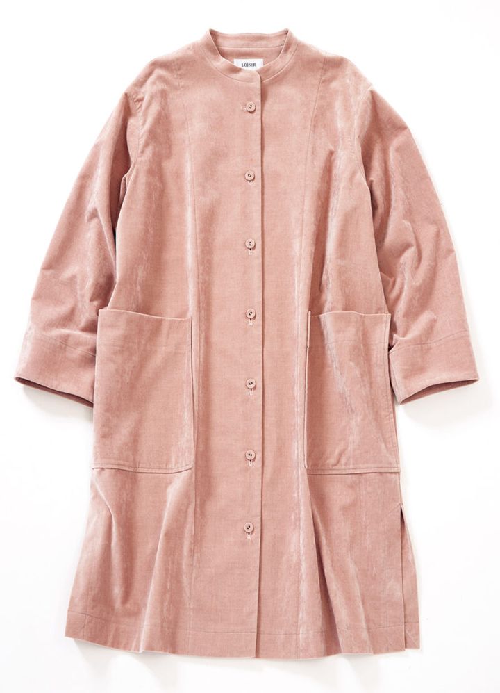 やさしい光沢のスモーキーピンクのコートはスエード調。