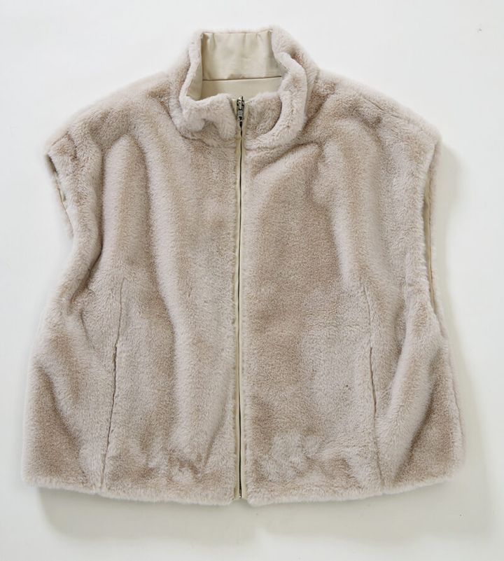 存在感のあるエコファーのベストはオフショルダーなので、重ねたときに肩のラインがなじみます。