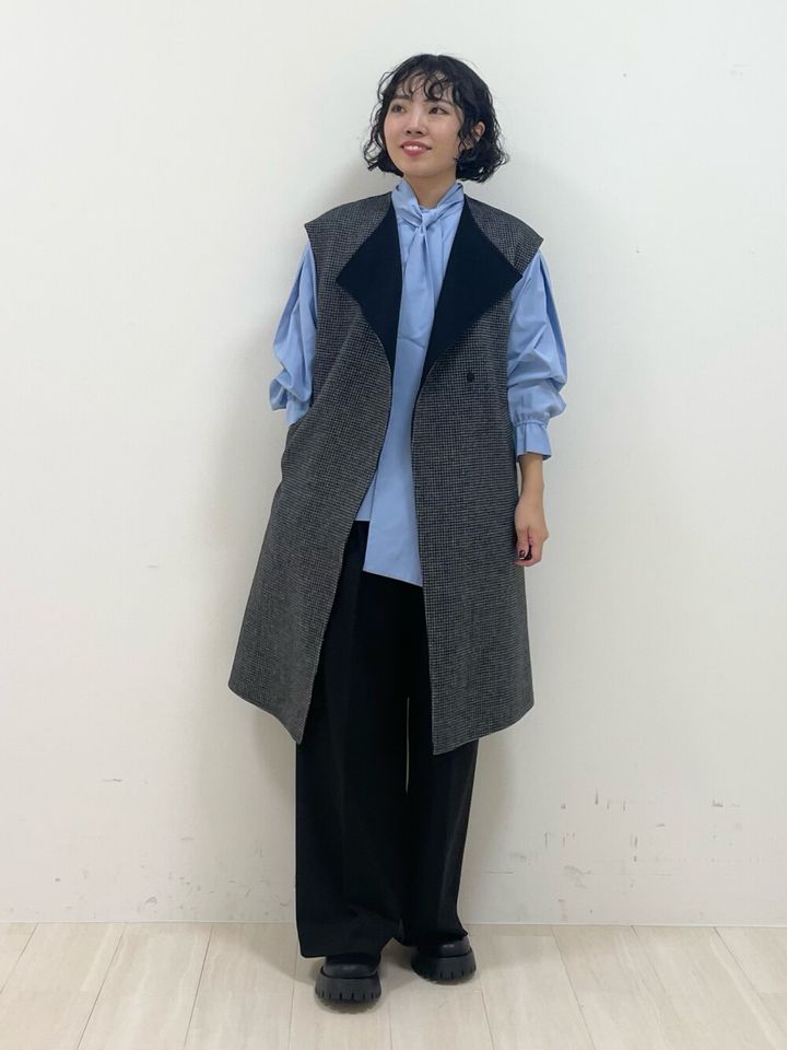 ボウタイシャツに、リバージレコートを合わせたコーディネート。ウール混のリバーコートの袖をなくし、トレンドのジレ仕様に仕上げたアウターは、ロングベストのような感覚でさらりと羽織れます。