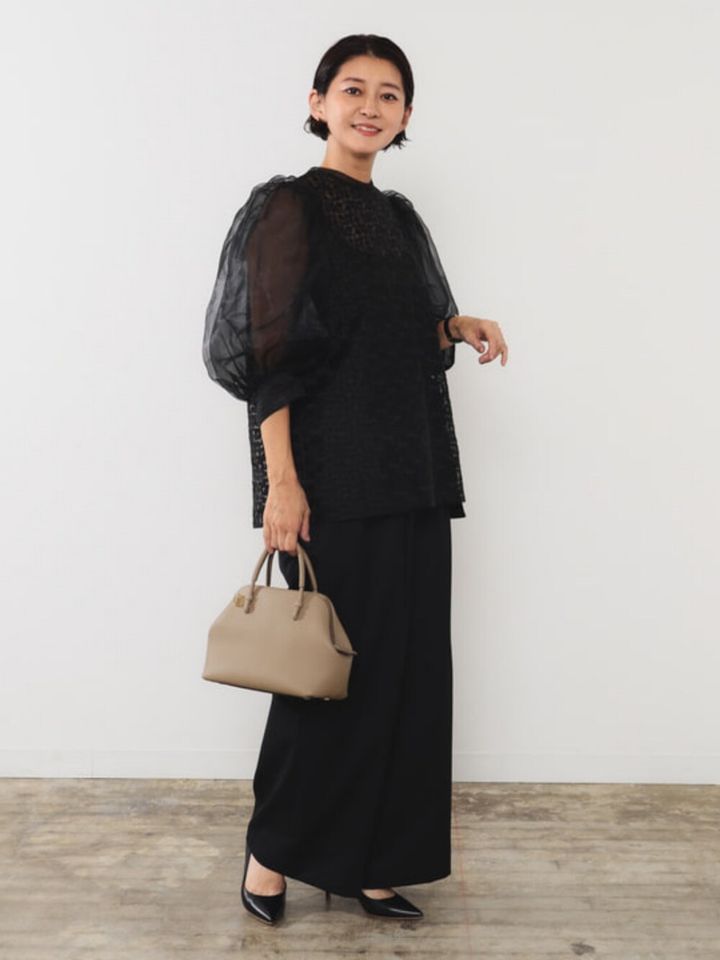 こちらのように刺繍が入っていて、たっぷりとボリュームのある袖に上品な透け感のあるブラウスを合わせると、ホテルでの会食などにもぴったりのドレスアップコーデに。それぞれ単品でも着まわせるのでコスパも良く、人に会う機会が増えたり、特別なイベントがある年末年始にもおすすめです。