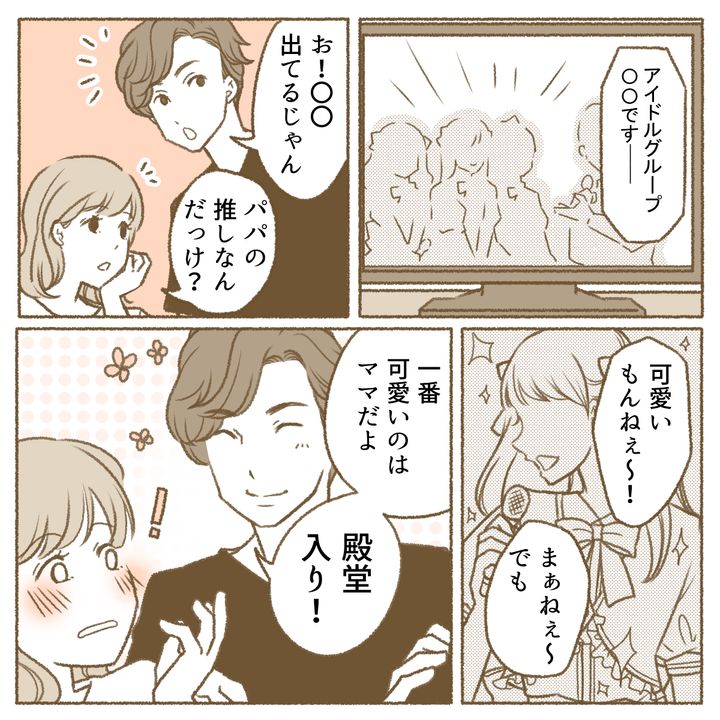 なんの気なしに見ていた番組に、とある女の子アイドルグループが登場。そのなかの1人を見て「そういえばこの子、夫の推しだったなあ」なんてママは考えていたのかもしれません。あふれんばかりの笑顔、弾けそうな肌の透明感、画面の向こうでキラキラと輝く女の子たち。どれだけたくさんの人が画面に映っていても、すぐ見つけられる。それが“推し”という存在なのです。一瞬で画面に釘付けになる夫。