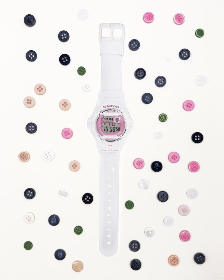 やわらかなピンクの文字盤と、クリーンなホワイトのケース&バンドのコントラストが、明るく軽やかな印象を演出。裏蓋にはMadhappyのロゴを刻印し、LEDバックライトを点灯させると、LCDディスプレイ上にMadhappyロゴのシルエットが浮かび上がる特別仕様に。さらに、本コラボレーション限定のカスタム・コーブランディングパッケージが付属する。