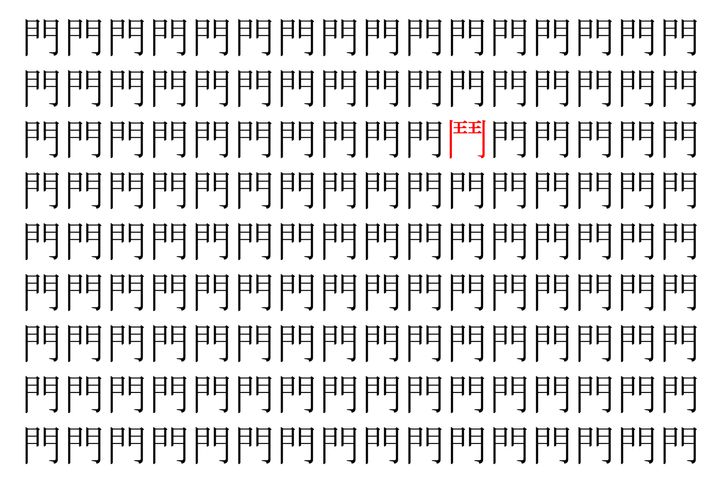 画像の中には、「門」という漢字が縦に9行、横に16個並んでいます。 全部で144個となりますが・・・、そのうち1つは「異なる漢字」となってますよ!!