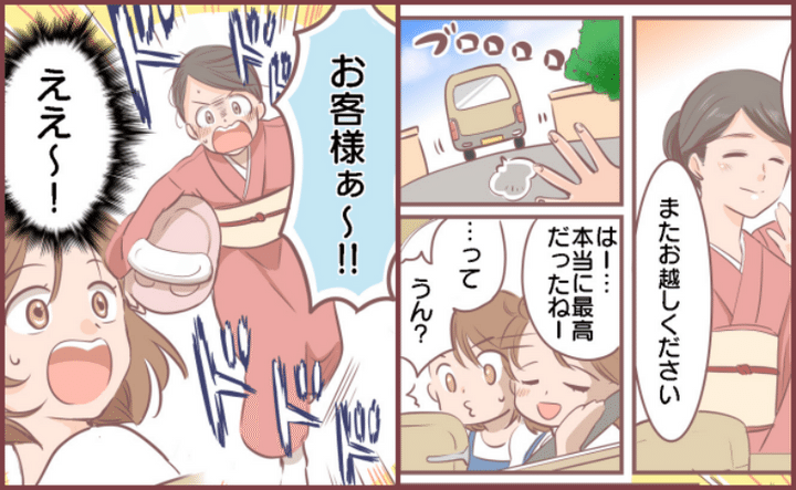 車を発進させて、宿の駐車場を出発しようとしたところ、バックミラーに何やら人影が……。なんと、さっきまでにこやかに手を振っていた仲居さんが、髪と着物を振り乱しながら、猛ダッシュで車に近づいてくるのです。