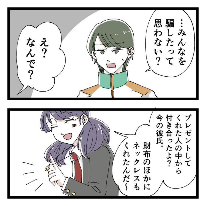 「・・みんなを騙したって思わない?」呆れたようにたずねる先生に、「え?なんで?」と不思議そうに言う女子生徒は、「プレゼントしてくれた人の中から付き合ったよ?今の彼氏。財布の他にネックレスもくれたんだ~」と貰ったネックレスを指に引っかけて嬉しそうに言ったのでした。