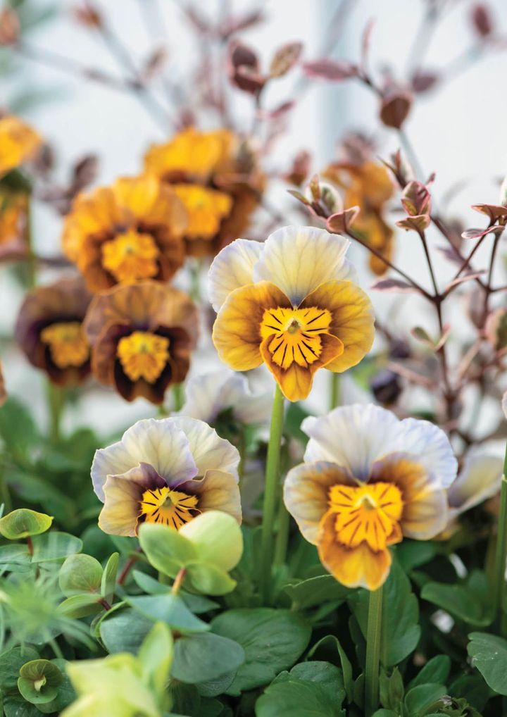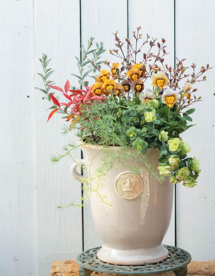 鉢も自慢できる品ぞろえのオニヅカの中でも、ちょっと高級感が漂う「キューポット」を使った寄せ植え。かの有名なイギリスの王立植物園「キューガーデンズ」公認の鉢です。そこにシックな花色のビオラを中心にして、さまざまな葉ものや低木を合わせました。高さのある鉢なので、手前にロータスやオレガノをしだれさせているのがポイントです。