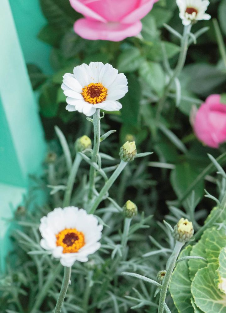 黒田健太郎さんが当店に来てくれたときに歓迎の気持ちを込めて作った寄せ植えです。プランターのエメラルドグリーンから遠ざからない花色を考えて、ピンクのミニバラを最初にセレクト。あとはハボタンのグラデーションや、ガーデンシクラメンとスイートアリッサムの赤を効かせました。春を意識してリーフはシルバー系ではなくイエロー寄りに。だれかをイメージして寄せ植えを作るのも楽しいものですよ!