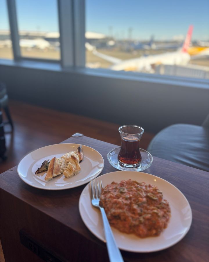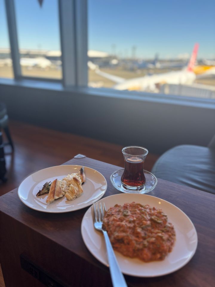 フライト前にトルコ風卵料理のメネメンやピザ窯で焼き上げたピデ、香り高いトルコティーを♡ このほかにも、サラダやスープ、お寿司、バリエーション豊富なドリンクが揃っていて、「ここから離れたくない」と本気で思ったほど。