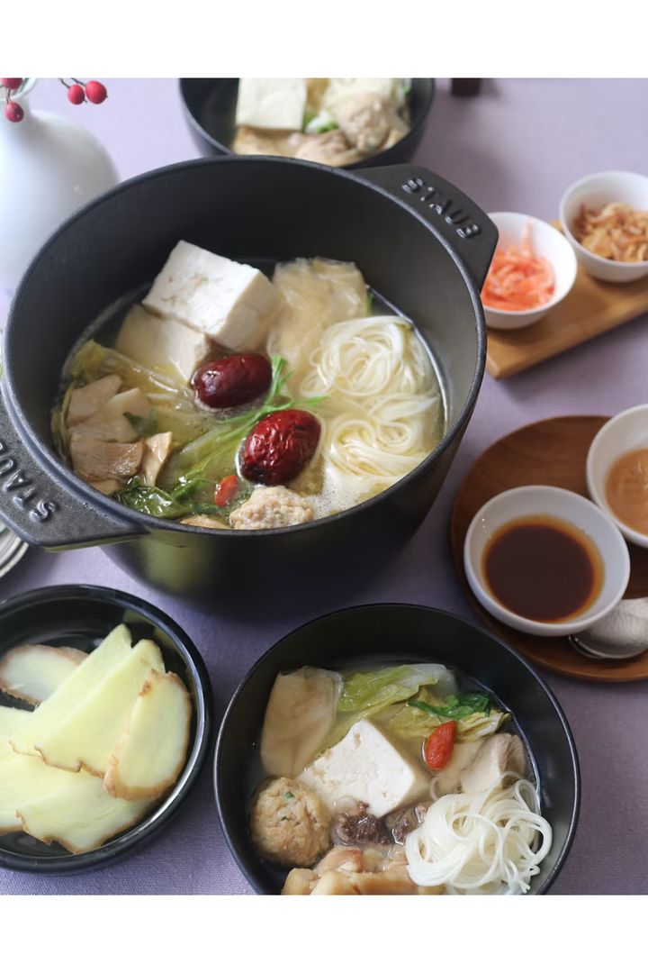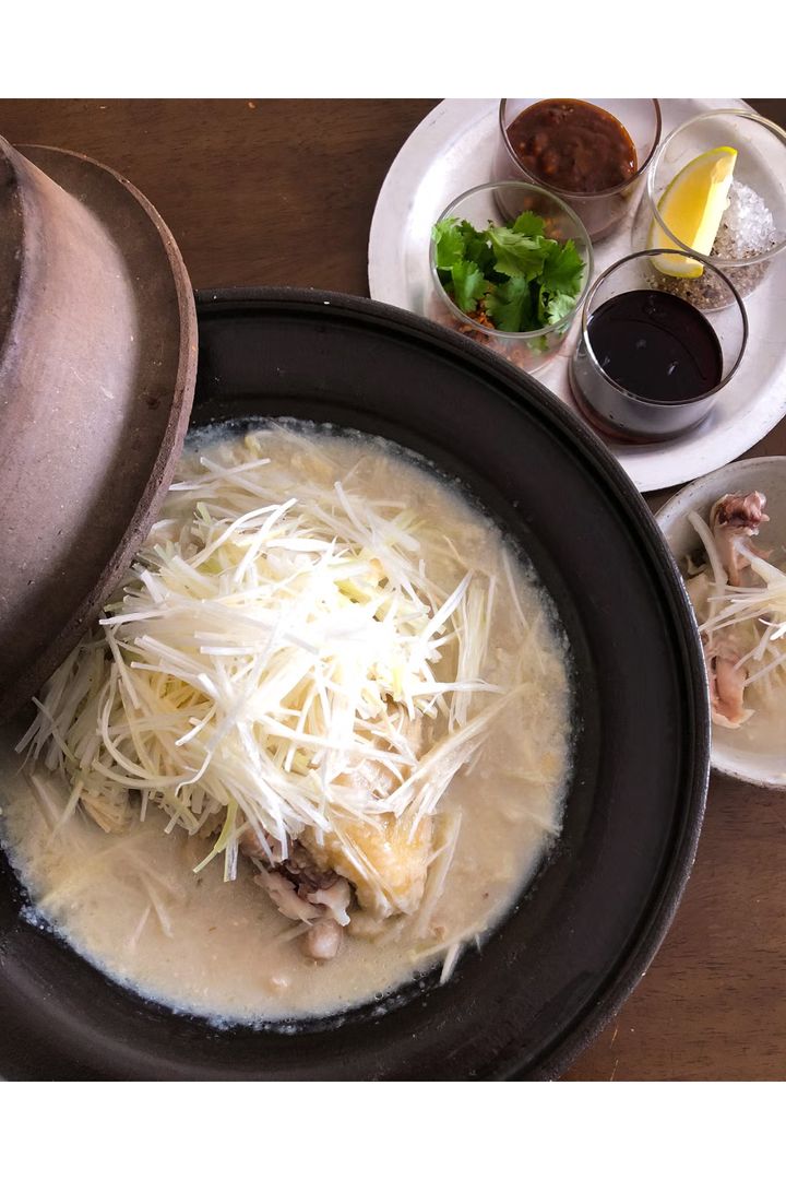台湾で親しまれている伝統的な薬膳スープ「麻油雞」を鍋にアレンジ。しょうがをたっぷり加えた、澄んだ味わいのチキンベースのスープに、身体が芯からあたたまる。〆にはそうめんを加えて、鶏のうま味が染み出たスープを余すことなく堪能して。