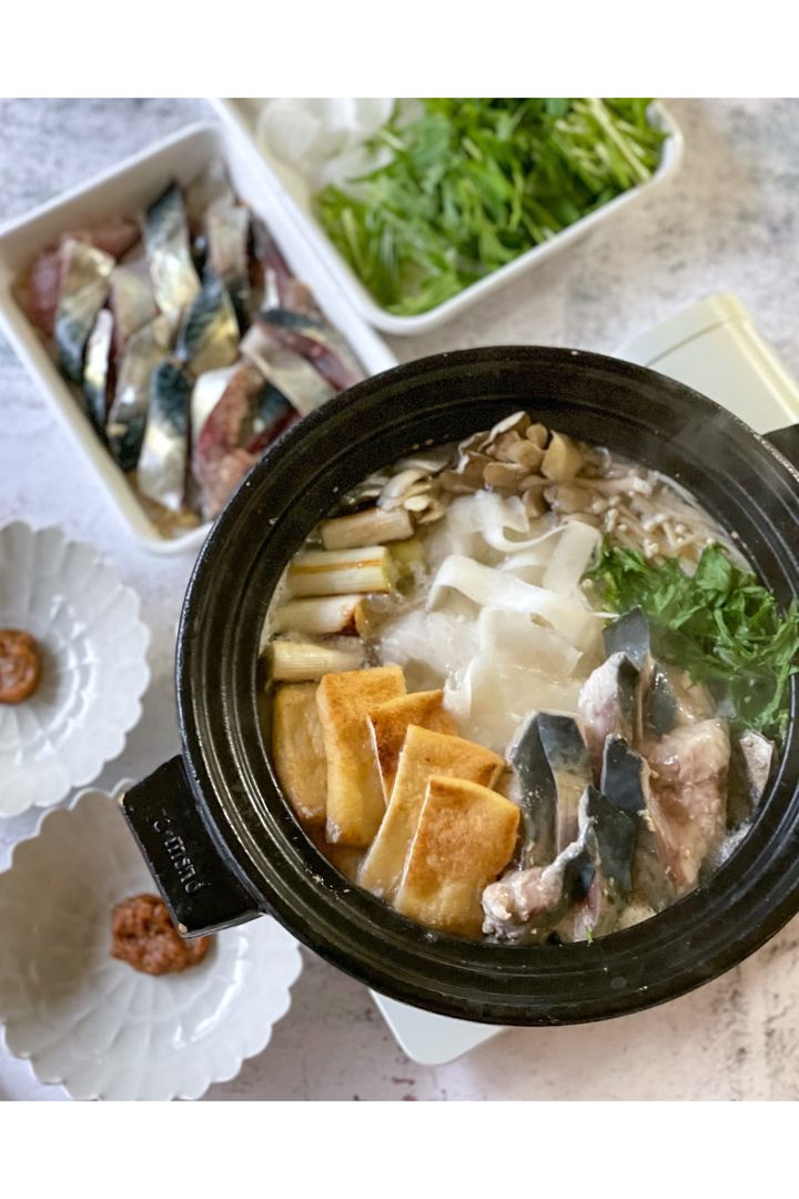 焼いたねぎと油揚げがスープにうま味とコクをもたらし、鍋のおいしさをぐっと底上げしてくれる。オリジナルの味噌だれにスープを溶かせば、思わず飲み干したくなるほどのおいしさに。さばや大根、きのこなど、そろえやすい材料でさっと作れるので、ぜひ一度お試しあれ。
