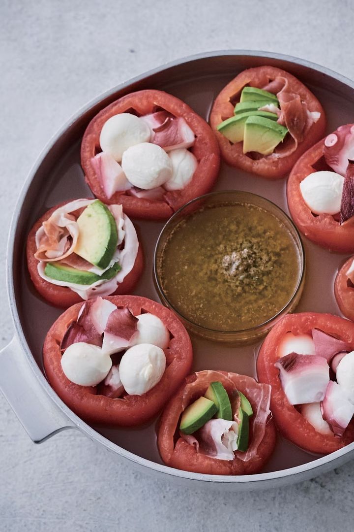 トマト8個を器のようにくり抜き、半分にはミニモッツァレラとゆでたこ、残りの半分にはアボカドと生ハムをイン。鍋の周りに交互に並べ、鶏がらスープを流し入れて、トマトが温まったら完成。ケイパーやアンチョビのうま味がつまったソースをかけて、ワインと一緒に召し上がれ。