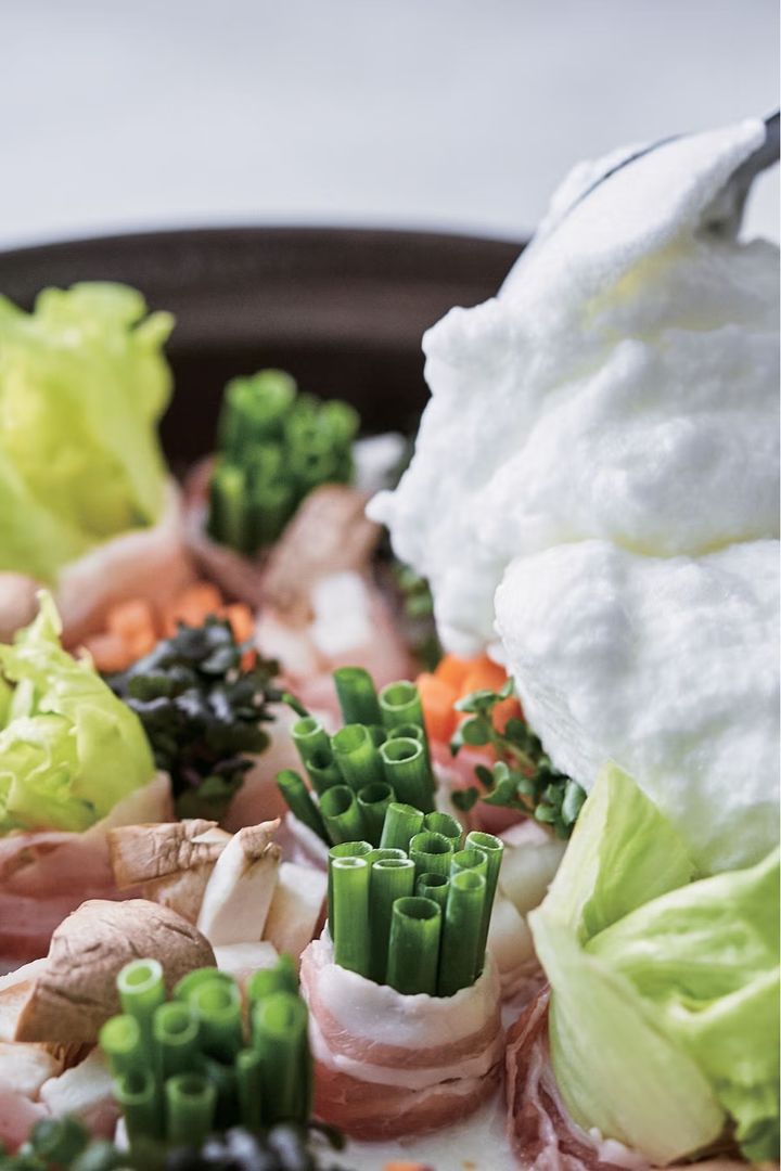 豚バラ肉でにんじんや大根などの野菜をくるっと巻いて、深めの鍋にぎゅっと詰めた、目にも楽しい鍋レシピ。豆乳ベースのスープを流し込み、メレンゲをのせて加熱すれば完成。ピリ辛い麻辣だれ&口の中でシュワシュワほどけるメレンゲに絡めて食べれば、いつもの野菜鍋がもっと楽しくなるはず。