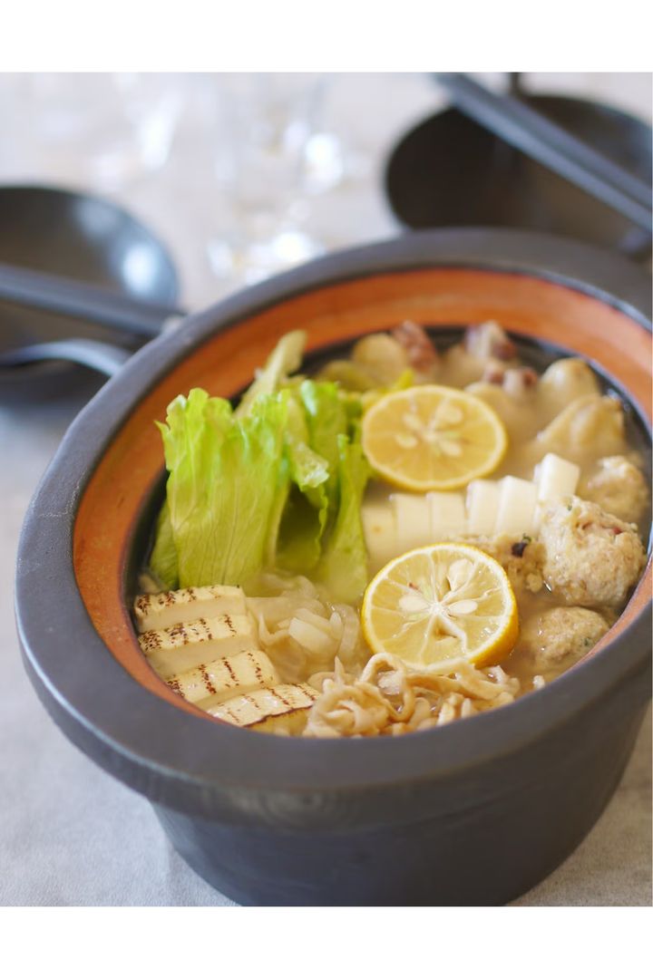 もちもちとした食感がクセになる、たこ入り鶏つくねがメインの鍋。柚子香るさわやかなスープにバターを加えることで、さっぱりとした飲み心地のスープにコクがプラスされて、洋風のニュアンスに。大根や山いも、レタスなどの野菜をたっぷり入れて楽しもう。