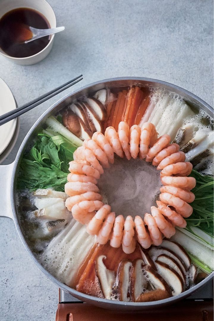 いつもの寄せ鍋もプレゼンテーションを工夫するだけで、新鮮な印象に。セルクルにむき海老をかけるようにセットし、周辺には薄切りにした野菜やきのこを彩りよく並べよう。野菜と魚介のだしだけで、奥深い味わいに仕上がる。