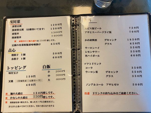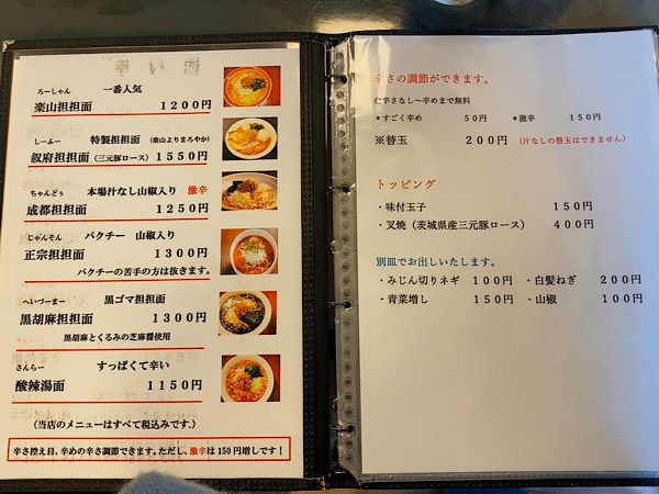 担々麺5種類をメインに、酸辣湯麺や麻婆豆腐などがラインナップされています。なんと!平日は200円でライスが食べ放題になるようです。今回は1番人気の「楽山担担面」と「黒胡麻担担面」を注文しました。