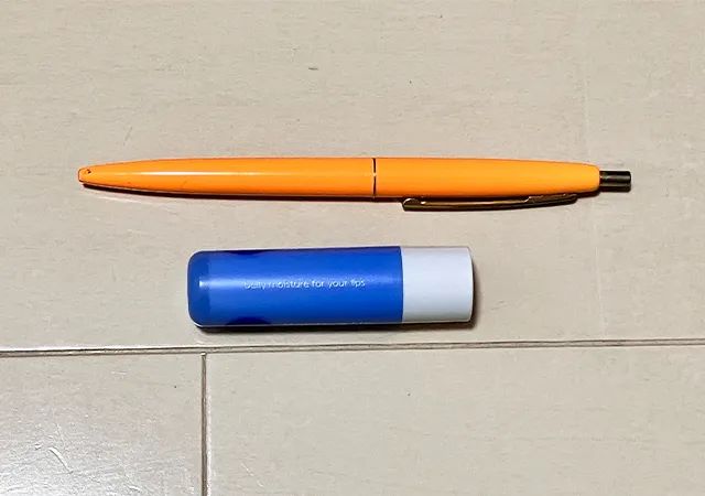 用意したのは、ボールペンとリップクリーム。小さなカバンで外出する時でも、必ず持ち歩くアイテムです。