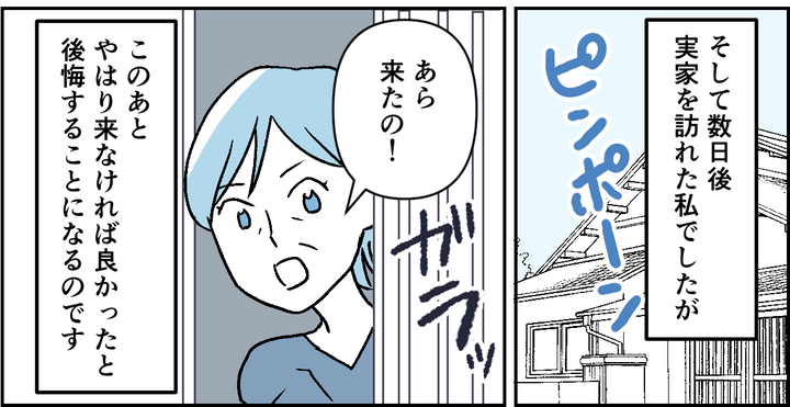 父に喜んでもらいたくて、数日後に実家を訪れることを決心しました。当日、玄関で母に迎えられた瞬間、胸の中の不安がふっとよみがえり、来なければよかったかもしれないという気持ちがよぎりました……。