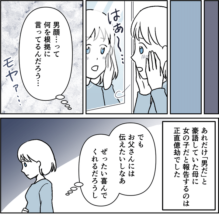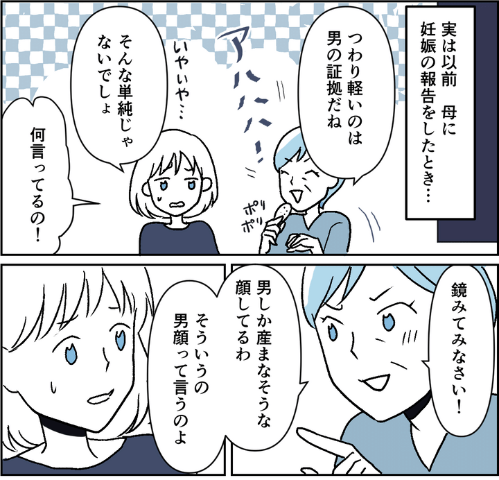 母は「つわりが軽いのは男の証拠」と言い、私が否定すると「鏡を見てみなさい、男顔よ」と続けました。言葉自体は軽い冗談のつもりだったのかもしれませんが、私にはその一言が思いのほか重く感じられ、戸惑ってしまいました。