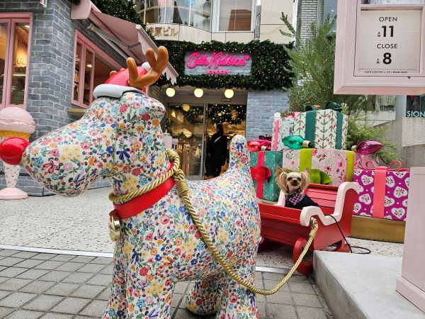 また、表参道店のエントランスに飾られている創業者キャス キッドソンの初代飼い犬「スタンリー」が赤いソリを引いています。ソリには「FOR DOGS ONLY」のステッカーが貼ってありました。ワンちゃんを乗せて撮影が可能です。