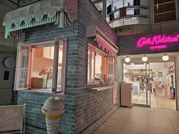 「キャス キッドソン(Cath Kidston) 表参道店」です。2024年秋の日本再上陸後初の路面店として2025年3月にオープンしました。表参道店のエントランスには、キャス キッドソンのアイスクリームショップが併設されています。