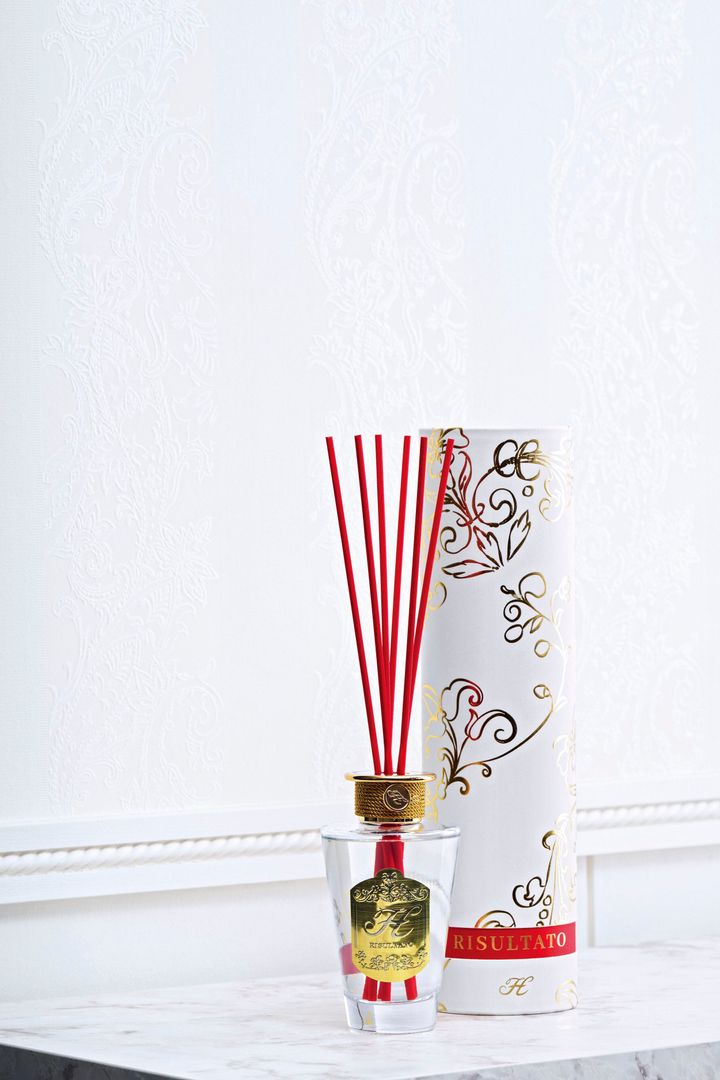 美しいガラス製のボトルに、真紅のリードスティックが優雅な空間に似合う。上質な和紙の箱は紅白に金色のおめでたいデザインなのでギフトにも。関東圏のインテリアショップやWebサイトで販売。