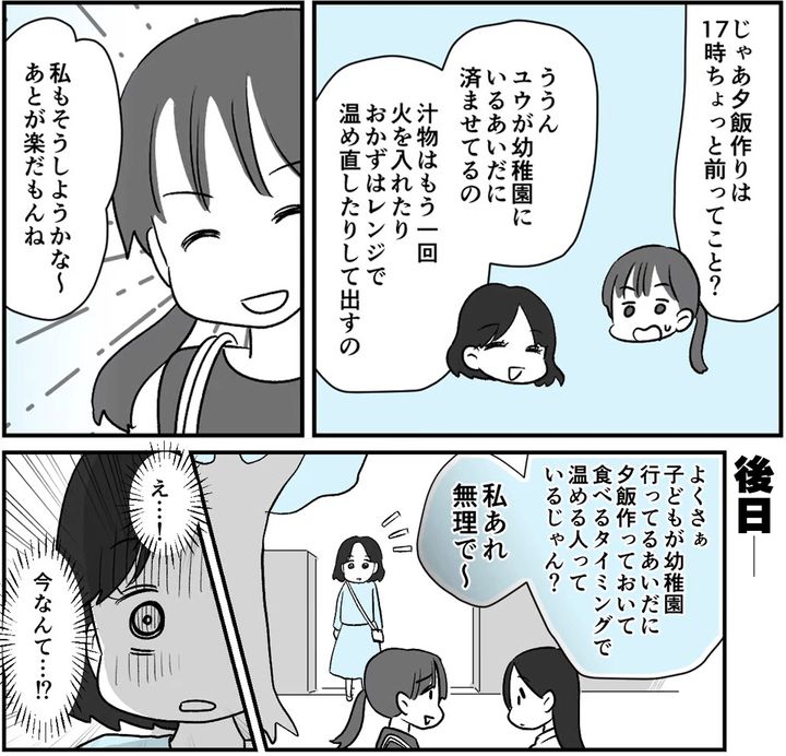 『幼稚園の子どもがいます。うちの子は夕方5時になったら「お腹空いた!」と言うので、大体5時半ごろには私も一緒に夕ご飯を食べます。夕飯は幼稚園のお迎え前に作っておき、食べたいと言ったときにすぐ用意ができるようにしてあります。先日ママ友にそのことを言うと、「先に作っておいたら、後で楽だもんね。うちもそうしようかな」と言われました。 ですが、そのママが他のママさんたちと話していて「昼過ぎにおかずを作っておいて後で温める人がいるけれど、自分が後で楽をしたいからといってちょっとどうかと思うわ」と言っていました。たしかにそれは正論かなとは思いますが、落ち込んでしまいました。やっぱり先におかずを作っておくのはだめですか? 皆さんはどんな感じですか?』 出典:https://mamastar.jp/bbs/topic/4503402