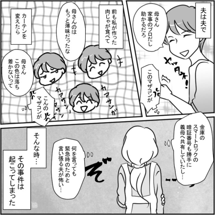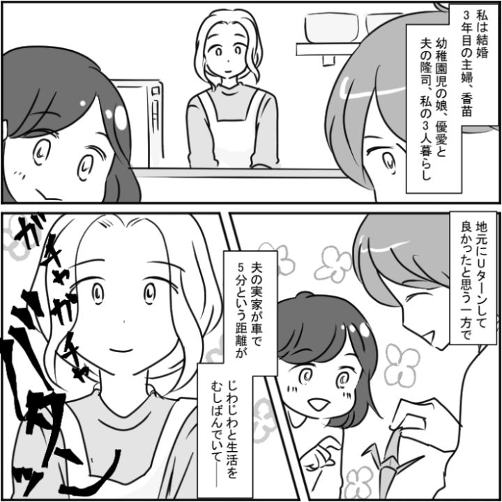 主人公は夫と娘と3人で暮らす主婦。夫の実家が自宅から近いことが原因である悩みがあって・・・。