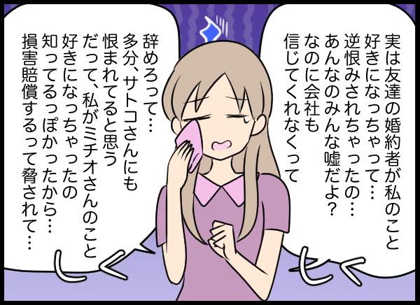 前の話を読む。損害賠償を請求されサトコを罵倒するが冷静に「会社の決定」と反論され、会社を去るよう告げられる。横田を見かけたミチオは「大丈夫?」と声をかけるが…。