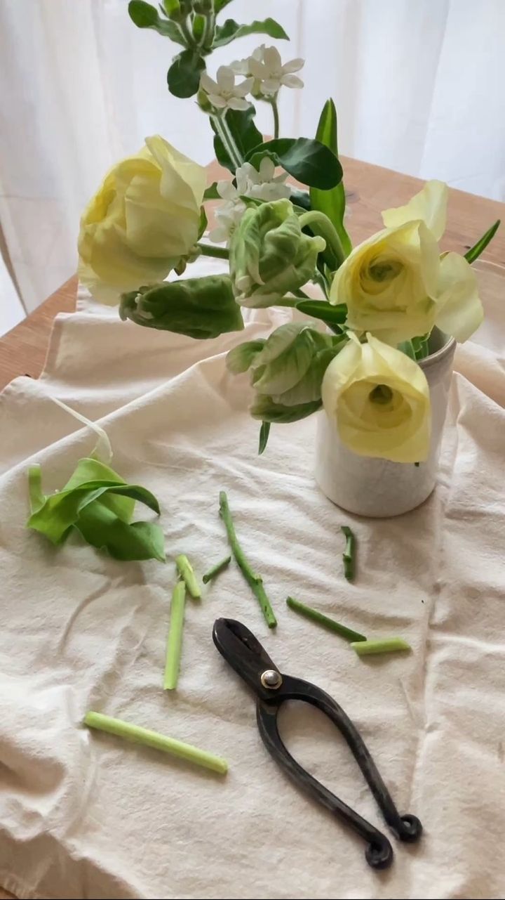 そんな花同士が主張し合うのではなく、それぞれの個性が同じ空間にあることを心がけ、ラナンキュラスのやわらかな重なりやチューリップの首をかしげるような動きに、オキシペタルムの小さな白い花が静かに寄り添うようにいけました。