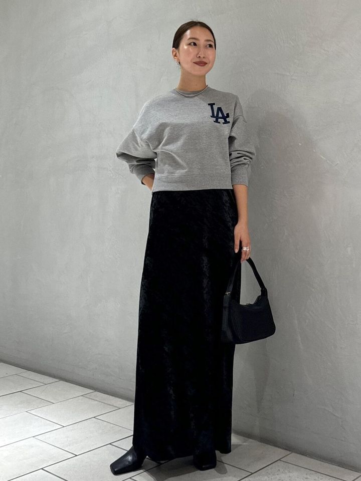 写真のように上からスウェットやTシャツを重ねても、ワンピースの下にブラウスやシャツを着てもOK。縦長のシルエットなので、ジャケットやブルゾンなどオーバーサイズのアウターとも好相性です。