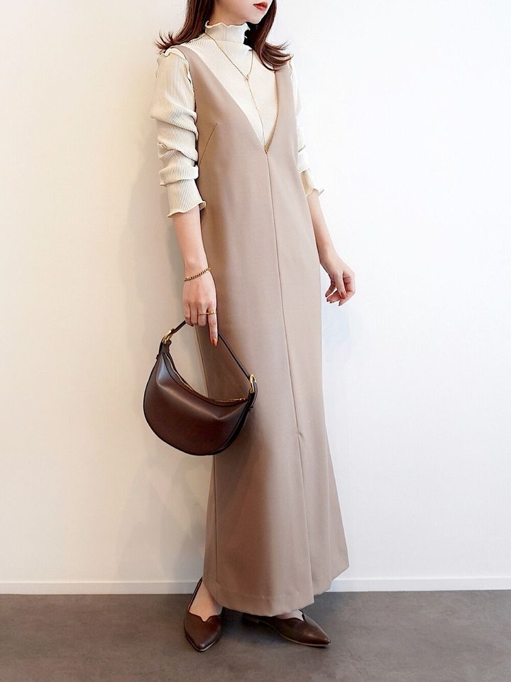 写真のマーメイドシルエットのワンピースは、深めのVネックと女性らしいラインが魅力。アームホールが広めに作られているため、厚手のインナーも着られます。長い期間着られるコスパの良さも魅力です。