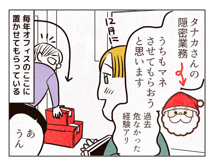 タナカ家のサンタさんは、毎年職場へプレゼントを届けてもらうようです。許可を取ってクリスマス近くまでオフィスの隅に置いています。いいアイデアですね。しかし……そんなアイデアにも落とし穴が。サンタのみなさん、落とし穴には気をつけてくださいね。