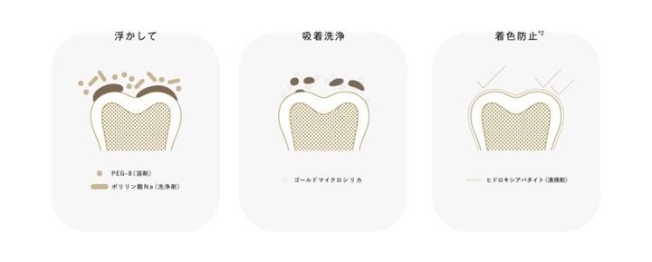 ①2つの洗浄成分が汚れを浮かす ②ゴールドマイクロシリカが吸着 ③ヒドロキシアパタイト(清掃剤)が表面をなめらかに整える