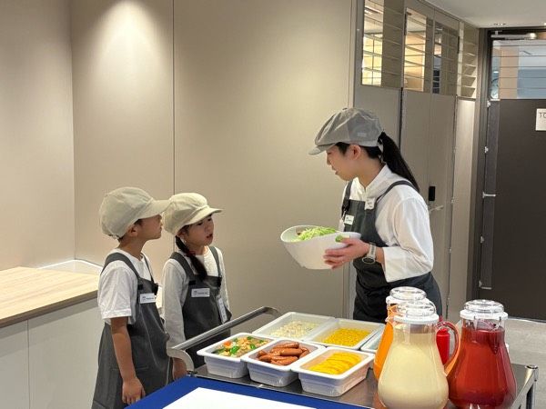 「ホテル」パビリオンでは、フロントで予約確認やチェックインの業務を行う「ホテリエ」、ベッドメイクなどの客室清掃業務を行う「メイクスタッフ」、朝食ビュッフェの準備として食事や食器などの配置を行う「パントリースタッフ」の3つの役割に分かれて、宿泊客をおもてなしします。おもてなしの基本や、チームワークの大切さを学びます。