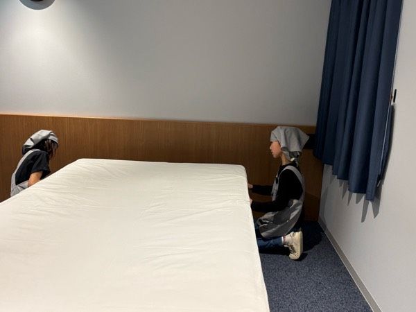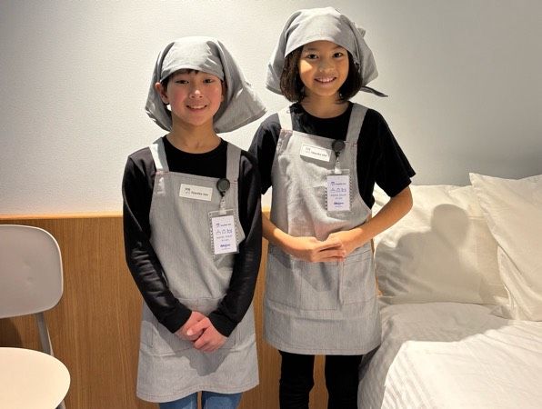 東横インにもちろん泊まったことがある大人たちも、本当のホテルが完全に再現されたリアルな作りに驚いていました。 「ホテリエ」ではあたたかくおもてなしするために、おじぎや笑顔の練習をしていました。 「パントリースタッフ」が朝食ビュッフェの準備をする様子を見て、実際のホテルでもきっとこういう風に準備されているのだろうなと思いました。 「メイクスタッフ」はベッドメーキングの時に「キャラメル折り」というシーツをきれいに整える技を教えてもらっていましたが、ちゃんと覚えてきれいにできるようになれば、家でも使えそうでしたよ!