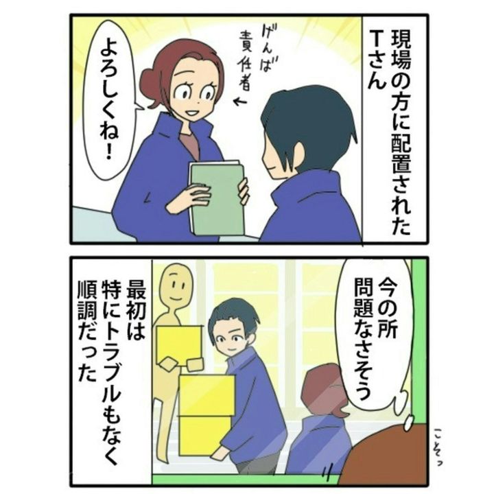 一見、真面目で人当たりが良さそうな中途社員・Tさん。しかし、このTさんが次々と問題を起こします。デスク仕事を任せたところ、先輩社員の文章をまるまるコピーして提出。そこで、課長判断で現場の方へ配属されます。
