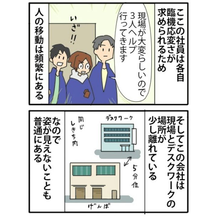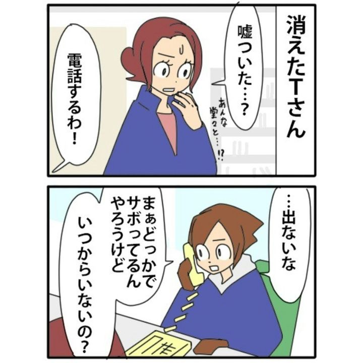 このお話は、著者・カモちも(@kamochimoq)さんが実際にあった話をベースに描いています。真面目で人当たりが良さそうなTさんが、中途社員として入社してきました。しかし、文書の作成の仕事を任せたところ、先輩社員の文書をまるまるコピーして提出してきたのです。課長がデスク仕事は向いてないと判断し、現場の仕事を先に指導します。ところが、ある日突然、Tさんが消えます…。勤務時間中に姿を消すなんて、社会人としてありえない行為ですね。自分勝手な行動は周囲に迷惑をかけるだけではなく、信用もなくしてしまいます。