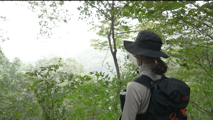 高い木々の間を登り続けてようやく小仏峠に。この峠はかつて甲州街道の難所として知られた場所。一寸八尺の小さな仏様が安置されていたことからその名が付いたのだそう。現在は見晴らしが良い休憩スポットになっているのですが、あいにくこの日は霞がかかって眺望はゼロ。残念。この先は徐々に道が狭くなり両側から木や竹が迫ってきます。その山道を登りながら「あ、さっき霞で景色が見えなかったのは、時透さん(霞柱)の出身地だったからかぁ!だから景色じゃなくて霞を見せてくれたんですね!」と思い出した美山さん。ナイスコメントです!