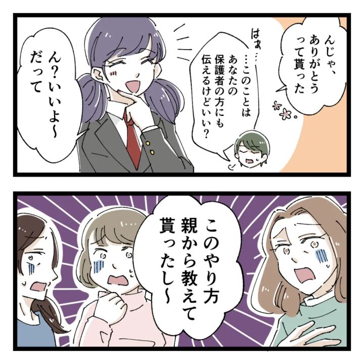 「んじゃ、ありがとうって貰った」と言い、「はぁ・・このことはあなたの保護者の方にも伝えるけどいい?」先生がそう言うと、「ん?いいよ~。だってこのやり方親から教えて貰ったし~」