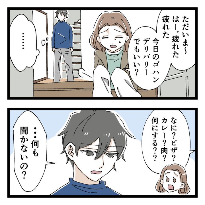 「ただいま~。はー疲れた。今日のご飯デリバリーでもいい?」私がそう言うと、「・・・」黙ったまま玄関にやって来たショウ。「なに?ピザ?カレー?肉?何にする??」と聞くと、「・・何も聞かないの?」と沈んだ表情で聞くのでした。